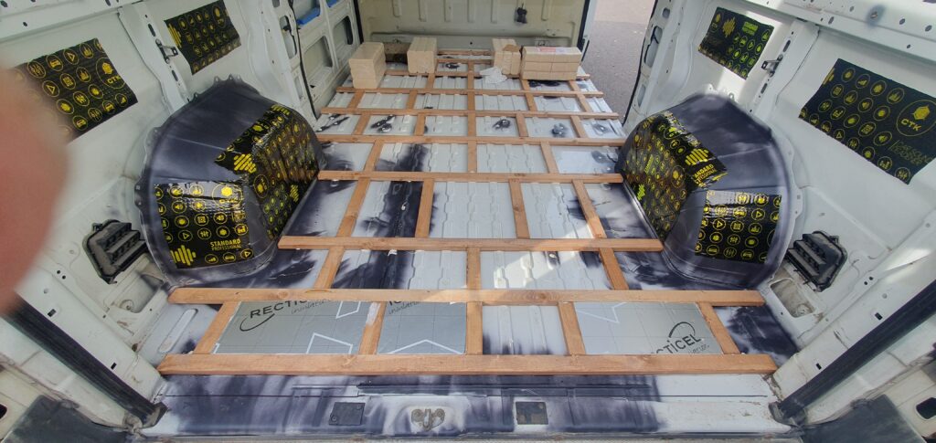Põrandakonstruktsioonis kasutasin 22x45mm puitu, mille immutasin puidukaitseõliga ja liiimisin sikaflexiga otse metalli külge. Liimimisel kasutasin raskuseks puitbriketi pakke.