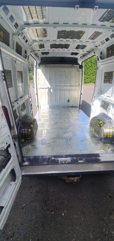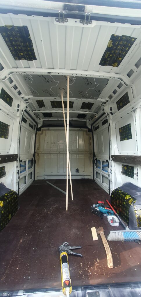 Pärast kaubaruumi pesu ja kerget roostekaitset/tõrjet katsin suuremad sirged pinnad pigimatiga. Heaks tööriistaks pigimati liimimisel on väiksema värvirulli käepide. Piisab kui pigimatiga katta umbes 30-40 % pinnast, rohkem pigimatti on pigem raharaiskamine.